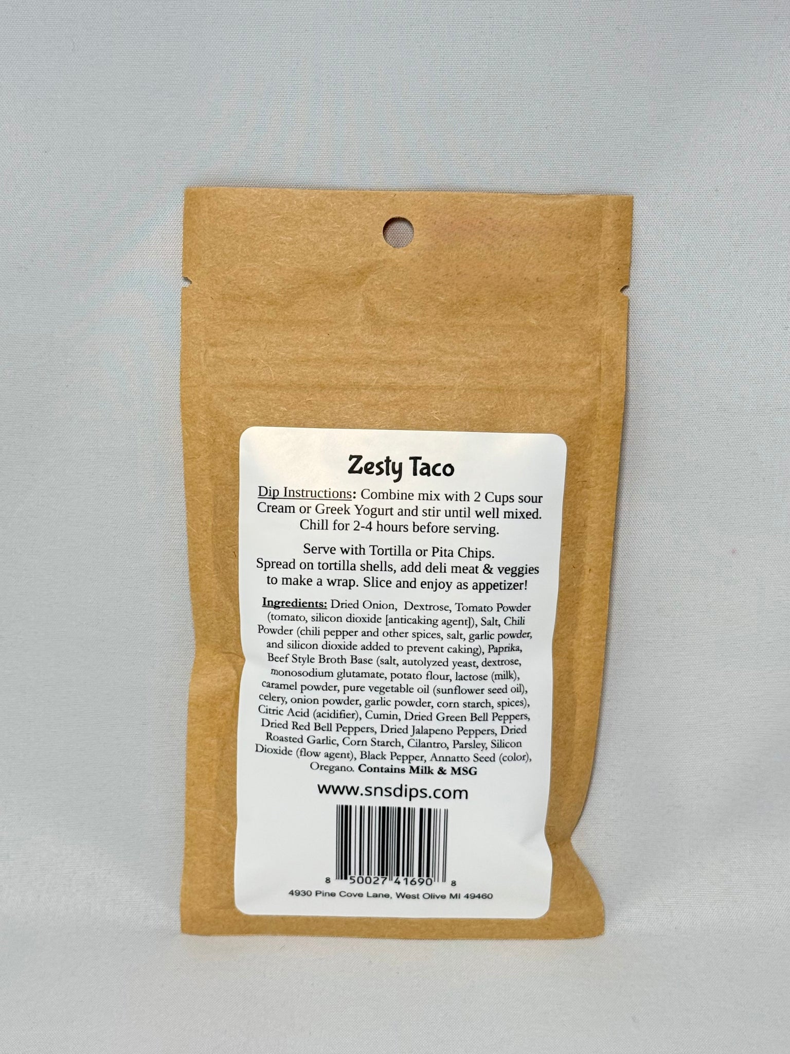 Turn up the flavor with this bold, Zesty Taco dip mix! Just mix with sour cream for a creamy, zesty dip that packs a punch of flavor and makes this dip a favorite for all!